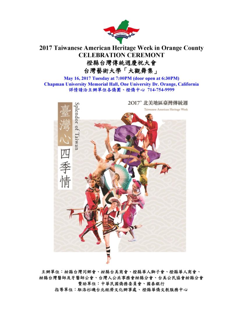 今年傳統週壓軸節目則為5月16日(星期二) 晚間7時在Chapman University Memorial Hall (地址:1 University Drive, Orange, CA 92866)舉行之臺灣傳統週慶祝大會,由遠從臺灣前來之【 國立臺灣藝術大學舞蹈學系大觀舞集】帶來【臺灣心.四季情 (Splendor of Taiwan)】。節目內容包含了武術舞蹈、紙傘舞、藝陣舞、 扯鈴、旗舞、扇舞及原住民舞蹈,還搭配廟會、歌仔戲、布袋戲、 油桐花等閩南與客家元素及生活場景,透過不同風格舞蹈的轉換, 呈現動與靜、剛與柔、熱鬧與沉潛, 傳達臺灣人親切質樸的情感與豐富的生命力, 藉此展現臺灣的文創實力, 期讓海外僑胞與國際友人看見臺灣表演藝術之美。