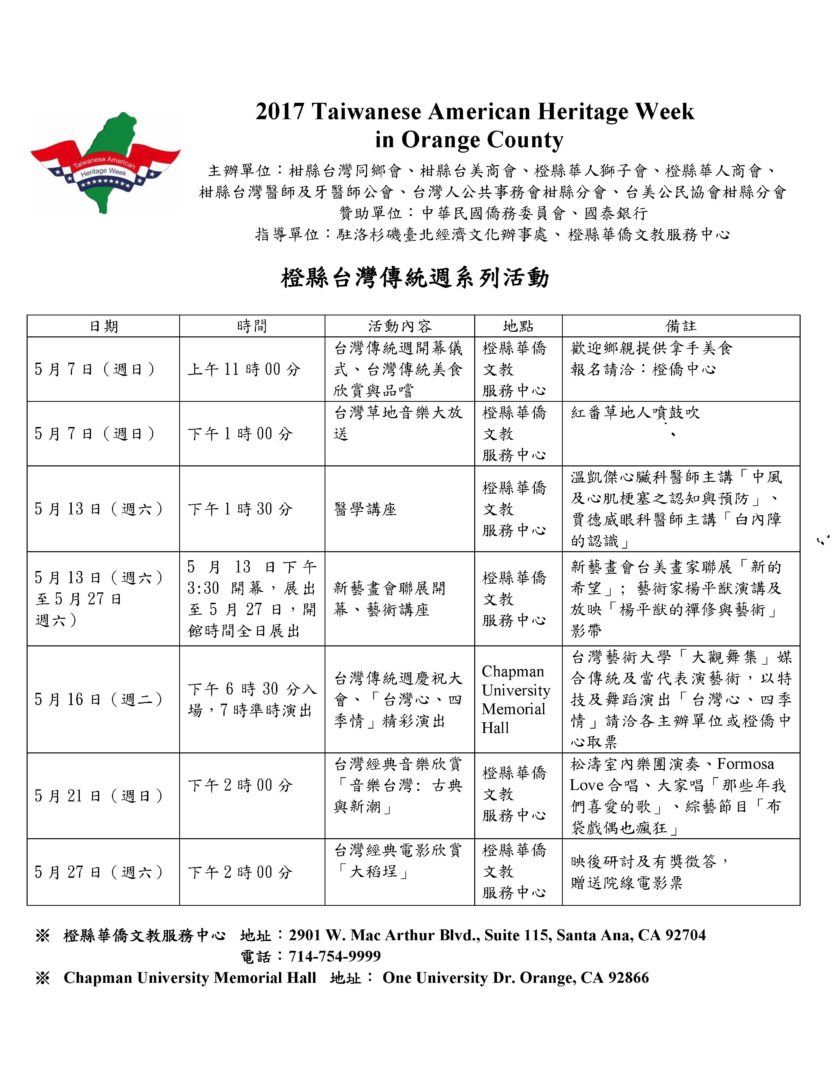 本年臺灣傳統週舉辦日期將從5月7日至5月27日,活動豐富、 多元且精采,5月7日(星期日) 上午11時將在橙縣華僑文教服務中心舉行開幕儀式後舉行—「 臺灣傳統美食欣賞與品嚐」,及下午1時「臺灣草地音樂大放送」 邀請生活藝術家劉邦蓉、蘇必用老師及沈定一等帶來薩克斯風、 keyboard、小喇叭等樂器演奏。此外, 5月13日醫學講座、新藝畫會臺美畫家聯展, 5月21日臺灣經典音樂欣賞、 5月27日臺灣經典電影欣賞等多項活動都精采可期, 詳細時間請參見附表。