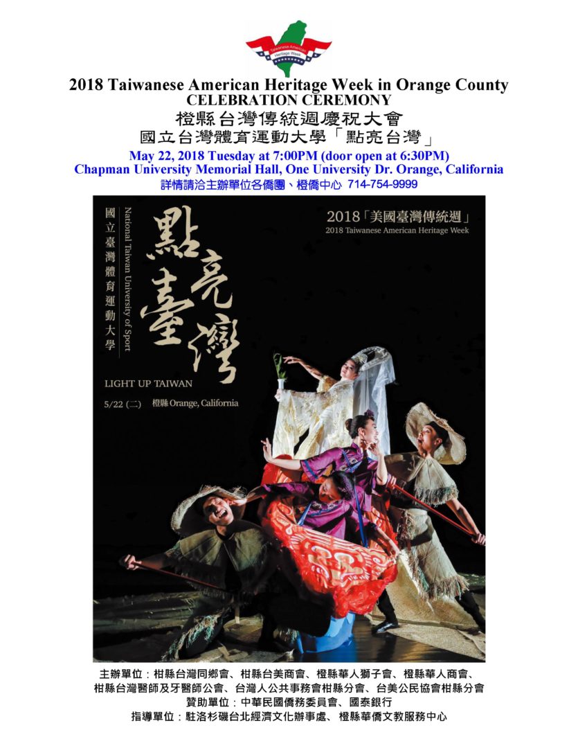 | 5/22 (Tue) | 7:00PM | Celebration Ceremony and special presentation: “Light Up Taiwan” by National Taiwan University of Sport at Chapman University Memorial Hall