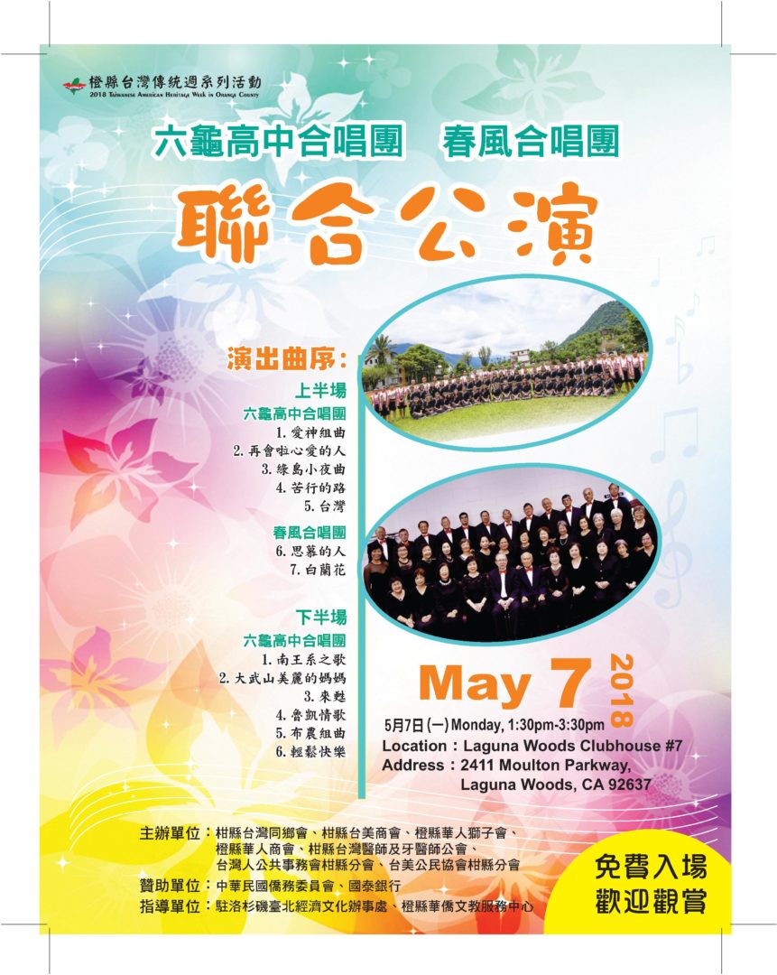 | 5/7 (Mon) | 1:30PM | Liou-Guei Senior High School Choir Spring Wind Chorus Concert; at Laguna Woods Club House #7 24111 Moulton Parkway, Laguna Wood, CA 92637 | |