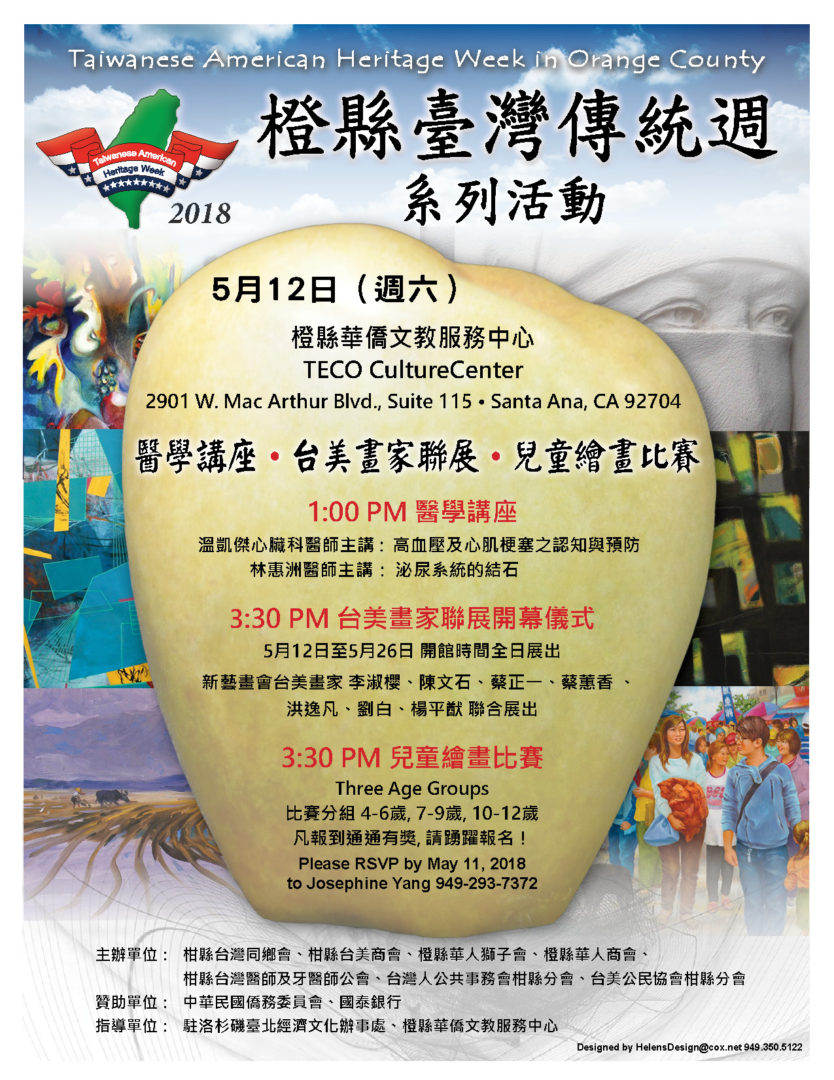 | 5/12 (Sat) | 3:30PM | Taiwanese American Artist Exhibition by Neo Art League, Exhibition 5/12 –5/26 and Children’s Art Contest, at TECO Culture Center | |
