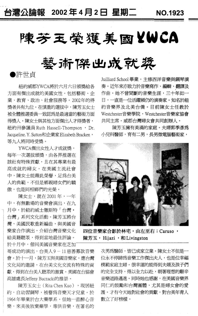 61. 紐約威郡YWCA藝術傑出成就獎 / Rita Chen Kuo 陳芳玉 /06/2002 February 2, 2018 Admin1 02. Winners of Prestigious Awards and Pride of T.A. Posted in 02/2018