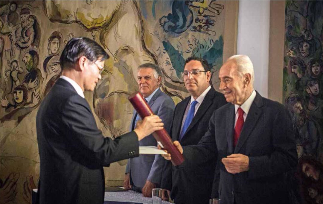 47. Wolf Prize in Chemistry (沃爾夫化學獎) in Israel / Wong Chi-Huey (翁啟惠) / 2014 August 30, 2017 Admin1 02. Winners of Prestigious Awards and Pride of T.A. 2014年沃爾夫獎的頒獎典禮上,作者從以色列總統、諾貝爾和平獎得主裴瑞斯(Shimon Peres)之手接下獎狀。沃爾夫獎肯定了作者對於醣分子科學、醣化學合成及醣蛋白合成的開創性貢獻。 Posted in 08/2017
